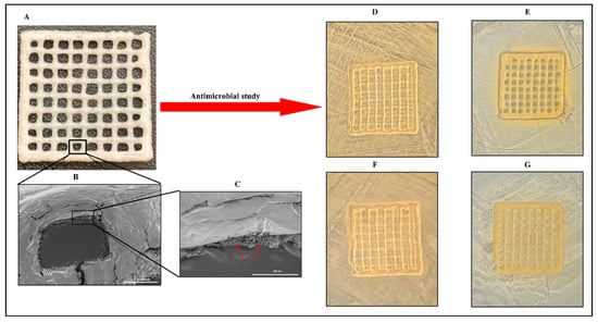 A three-dimensional, printed gelatin–alginate scaffold fortified with C. sativa oil. Lyophilized 3D-printed scaffold (A); scanning electron microscopy of 3D-printed scaffold (B); a single pore of the 3D-printed scaffold imaged through scanning electron microscopy (C); and the antimicrobial efficacy of a lyophilized gelatin–alginate scaffold fortified with or without C. sativa oil against Staphylococcus aureus (D,F) and Escherichia coli (E,G). Arrow marks indicate the porous structure in the freeze-dried composite. These pictures are reproduced with permission from [119] under a Creative Commons attribution (CC-BY−4.0) license.