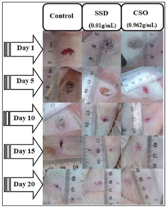 Effect of Cannabis sativa oil (CSO) on healing of burned skin in rats. The macroscopic morphology of burned skin wounds treated with cannabis sativa oil at 0.962 g/mL) and silver sulfadiazine (SSD) at 0.01 g/mL after 20 days demonstrates the promising effects of CSO in wound healing, showing comparable results to the standard medical treatment. Reproduced with permission from [121] under a Creative Commons attribution (CC-BY−4.0) license.