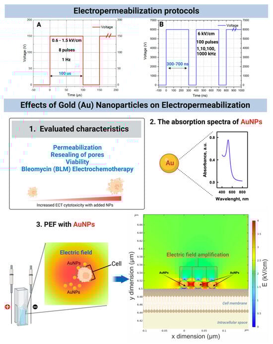 Nano-pulses are potentially advantageous for impedance mitigation in heterogeneous tissue in the high-frequency domain [8,9,10]. Also, they allow better controlled Joule heating, reduced muscle contractions, and minimized pain sensation and oxidation due to ROS [8,9,11,12,13]. Recently, it was shown (both in vitro and in vivo) that a residual transmembrane potential (TMP) can be induced, significantly potentiating drug/gene delivery when the pulse repetition frequency is in the MHz range, i.e., the delay between the pulses is shorter than the polarization time of the membrane [14,15,16]. The phenomenon significantly boosted the applicability of nsPEF for drug delivery, which was previously considered sub-optimal due to the lack of electrophoretic components and electrotransfer efficiency compared to ESOPE [17]. Previously, the application of nsPEF was limited to ablation techniques [18] and not applicable to ECT. While it was shown that such an approach (MHz pulse compression) is, in many cases, superior to ESOPE, it is still insufficient to mitigate the PEF’s non-homogeneity completely [19,20]. However, in this work, we optimized the methodology even further, i.e., we characterized the use of conductive gold nanoparticles (AuNPs) to serve as a distributed antennae for PEF amplification in vitro. The summary of the research covered in the paper study is presented in Figure 1.