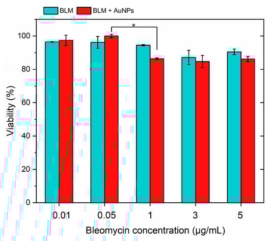 It can be seen that AuNPs were non-toxic to the cells, while BLM had a minor effect (<20%) on cell viability in the whole range of tested concentrations (0.01–5 μg/mL). Based on the acquired results, the 1 μg/mL BLM concentration was used further in the study.