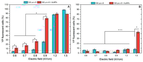 The effects of pulsed electric fields (100 μs × 8) on (A) cell plasma membrane permeabilization to Yo-Pro-1 and (B) cell plasma membrane resealing after 30 min, separately and in combination with AuNPs. Asterisk (*, ***) corresponds to a statistically significant (p < 0.05 and p < 0.001) difference, respectively. Red dash corresponds to untreated control samples.