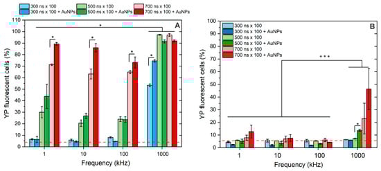 At the same time, the 500 ns and 700 ns pulses triggered saturated permeabilization (>95%), which was significantly higher than the effect of 1–100 kHz bursts. The impact of AuNPs was similar to microsecond pulses, i.e., the permeabilization threshold was reduced, and a higher number of YP fluorescent cells was observed (unless saturated permeabilization was already triggered by PEF alone). This was true for all the protocols involved in the study, except the lower frequency (1–100 kHz) and the 300 ns x 100 sequence. In this frequency range, no amplification of the effect was triggered, while the phenomenon was still present in the case of a 1 MHz burst.