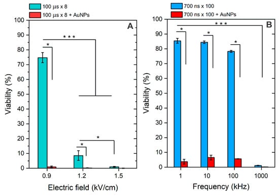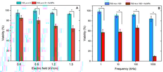 The effects of pulsed electric fields on cell viability (24 h after treatment), with (A) 100 μs × 8 protocols and (B) 700 ns × 100 protocols, separately and in combination with AuNPs. Asterisk (*) corresponds to a statistically significant (p < 0.05) difference.
