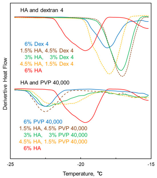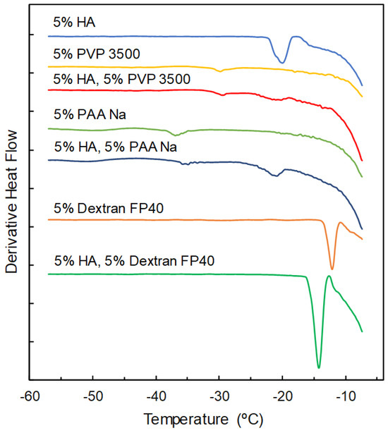 Derivative heat flow curves of frozen solutions comprising hyaluronic acid (HA), polyvinylpyrrolidone (PVP) 3500, dextran FP40, PAA Na, and their mixtures obtained through heating scans (20 μL, 5 °C/min).