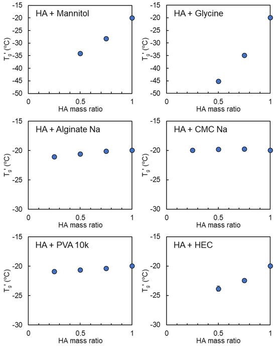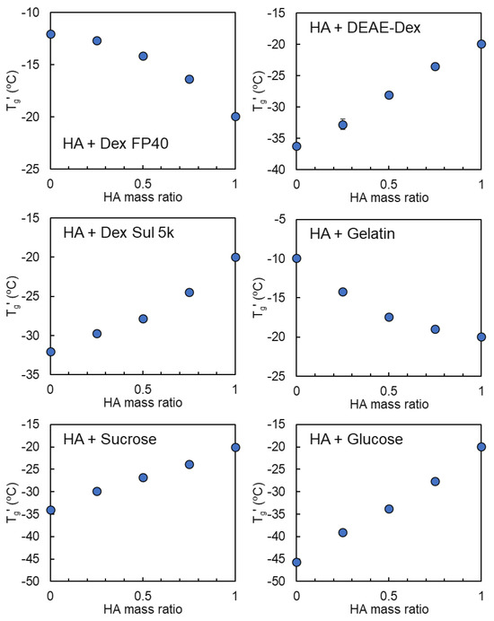 Transition temperature (Tg′) profiles of the frozen solutions comprising hyaluronic acid (HA) and co-solutes showing a continuous change according to the solute mass ratios (6% total, n = 3, average ± SD). The symbols denote the temperature of the first (◯) transitions in the heating scan.