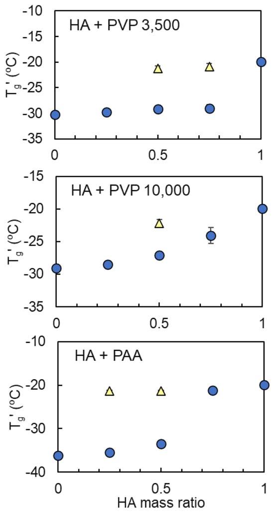 Transition temperature (Tg′) profiles of the frozen solutions comprising hyaluronic acid (HA) and co-solutes that did not show an obvious transition in the single-solute frozen solutions (6% total, n = 3, average ± SD). The symbols denote the temperature of the first (◯) transitions in the heating scan.