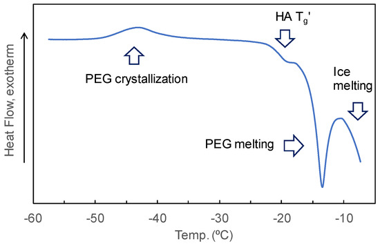 Single-solute PEG tends to crystallize and melt in heating scans of single-solute frozen solutions [58]. Certain HA and PEG combinations (e.g., 4.5% HA and 1.5% PEG 6000, w/w) showed thermal events of the concentrated HA phase (Tg′ at approx. −20 °C) and PEG phase (crystallization at approx. −43 °C and melting at approx. −14 °C) during a heating scan (Figure 6). The limited effect of HA on the size of the melting exotherm peak of PEG indicated their phase separation at wide mass ratios (Figure 7A). The crystallization and melting peaks should not appear when PEG and other solutes are kept in a mixed state in the freeze-concentrate phase.
