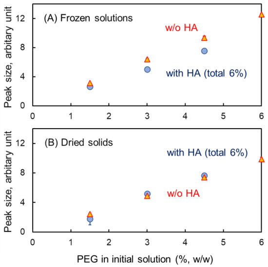 Size of the polyethylene glycol (PEG) melting exotherm peak in the frozen solutions (B) and solids dried in the DSC cells (A) (n = 3, average ± SD). The symbols denote the peak size of the samples with (◯) and without (△) HA.