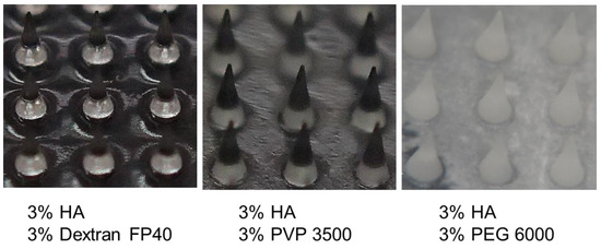 The aqueous polymer solutions comprising HA, polymer, and their combinations were dried at room temperature to prepare films to study the miscibility of the components. Table 3 summarizes the appearance of films obtained by drying aqueous solutions comprising HA and co-solutes (Images in Figure S1). Drying of aqueous HA solutions (6%, w/w) and HA combined with dextran 4, dextran FP40, gelatin, and HEC (3% each) resulted in transparent films. By contrast, the combination of HA with PVP 3500–40,000, PAA Na, DEAE-dextran 10,000, dextran sulfate Na 5000, PVA 10,000, and sodium alginate (3% each) resulted in slightly cloudy to opalescent films, which suggested the phase separation and/or uneven distribution of the polymers. Drying of the HA and PEG 6000 combination resulted in white brittle solids. A thermal scan of the films revealed the limited effect of HA on the melting peak of the PEG crystal, which appeared at approximately 55 °C (Figure 7B). Among the polymers that showed mixing with HA in frozen solutions, those with DEAE-dextran HCl or dextran sulfate 5000 resulted in the clouding of the film. The preparation of microneedles using the micromolding method resulted in transparent (HA, HA, and dextran), opaque (HA and PVP), and white (HA and PEG) solids (Figure 8), which were essentially similar to those of the films. The tip of needles formed by HA and dextran or PVP appeared darker due to the lighting.