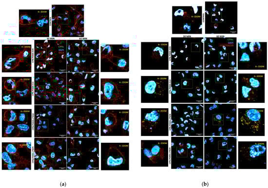 Intracellular localization of aptamer-decorated CPNs in TNBC cells. Representative confocal images of MDA-MB-231/cis cells exposed to 2 mg/L CPNs for 30 and 60 min and stained with WGA for cell membrane visualization (a) or LysoTracker Red for lysosome visualization (b).