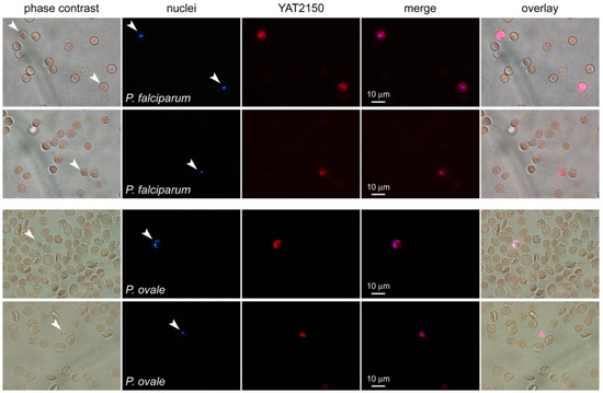 YAT2150 staining of clinical samples of P. falciparum and P. ovale infections. The merge panels refer to fluorescence images only. Arrowheads indicate the Plasmodium-infected red blood cells present in the microscope fields shown.