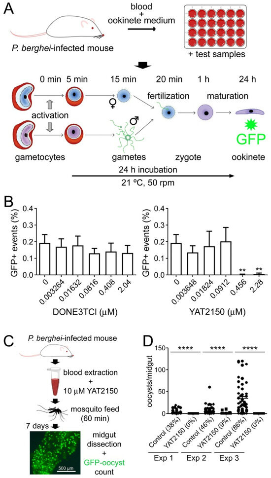 Transmission blocking assays. (A,B) Ex vivo P. berghei ookinete maturation assay. (A) Scheme of the experimental protocol. (B) Effect of DONE3TCl and YAT2150 on ookinete development. Mean values ± standard deviations are indicated (n = 3). **: p < 0.01 (one-way ANOVA, Dunnett’s post-hoc test). (C,D) Membrane feeding assay to test the effect of YAT2150 on P. berghei oocyst production. (C) Scheme of the experimental protocol. A total of 10 µM YAT2150 was added to blood infected with P. berghei and immediately fed to A. gambiae mosquitoes. Control feeding was the same blood mixed with DMSO at the same concentration as in the YAT2150-containing sample. The illustrative GFP-oocyst image is from Lantero et al. [33]. (D) Effect of YAT2150 on oocyst development in three independent experiments (Exp 1 to 3). Percentages in the graph indicate the prevalence of infection (% of infected mosquitoes). ****: p < 0.0001 (Mann–Whitney non-parametric test).
