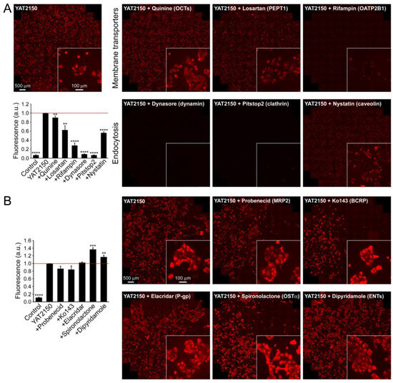 Caco-2 cells were grown in monolayer on a solid support at 37 °C in a humidified atmosphere with 5% CO2 and maintained in DMEM supplemented with 10% FBS, 2 mM L-glutamine, 1% MEM non-essential amino acids, 20 U/mL penicillin, and 20 µg/mL streptomycin (Life Technologies, Carlsbad, CA, USA). To identify YAT2150 influx and efflux mechanisms in Caco-2 cells, YAT2150 intracellular accumulation was determined by measuring its fluorescent emission at 610 nm under various experimental conditions as follows. A total of 50,000 cells/well were seeded in MW24 plates, and 24 h after seeding, YAT2150 influx and efflux were determined either in the presence or absence of FBS. For influx measurements, Caco-2 cells were preincubated for 20 min with various influx inhibitors, and they were further incubated with 5 µM YAT2150, in the presence of inhibitors, for 30 min. Then, cells were washed with PBS, and intracellular YAT2150 was determined (see below). For efflux measurements, cells were incubated with 5 µM YAT2150 alone or combined with the different efflux inhibitors for 30 min, washed with PBS, and incubated with the inhibitors alone, and intracellular YAT2150 was measured 4 h later. Intracellular fluorescent YAT2150 was detected by fluorescence microscopy (Thunder Imaging System, Leica Microsystems GmbH, Wetzlar, Germany) and analyzed by ImageJ 1.53q software (National Institutes of Health, Bethesda, MD, USA). In parallel, emitted fluorescence was measured in an iBright Imaging System and quantified by iBright Analysis Software 5.3.0 (Thermo Fisher Scientific, Inc.). Fluorescence in cells cultured for the same time in the absence of YAT2150 provided the negative control of the assay. YAT2150 fluorescence in cells cultured in the absence of inhibitors was the reference condition to which all data in the presence of inhibitors (and the negative control too) was compared. Inhibitors and concentrations used for influx transporters were 100 µM quinine (OCTs inhibitor), 100 µM losartan (PEPT1 inhibitor), and 100 µM rifampin (OATP2B1 inhibitor). Inhibitors and concentrations used for efflux transporters were 1 mM probenecid (MRP2 inhibitor), 10 µM Ko143 (BCRP inhibitor), 10 µM elacridar (P-gp inhibitor), 200 µM spironolactone (OSTα inhibitor), and 10 µM dipyridamole (ENTs inhibitor). These concentrations were chosen based on previously published transporter inhibitory profiles of these molecules (Supplementary Table S1). Endocytosis was blocked using either 20 µM dynasore (dynamin inhibitor), 20 µg/mL pitstop2 (clathrin inhibitor), or 100 µg/mL nystatin (caveolin inhibitor). Quinine, losartan, dynasore, pitstop2, nystatin, probenecid, Ko143, spironolactone, and dipyridamole were from Merck KGaA (Darmstadt, Germany) and rifampin and elacridar from Selleck Chemicals LLC (Houston, TX, USA). Data are expressed as mean ± SEM. Statistical significance was determined using Student’s t-test with Excel. Differences were considered significant when p < 0.05.