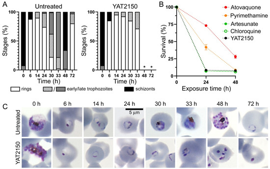Characterization of the fast-acting activity of YAT2150. (A) Stage arrest assay of 3D7 P. falciparum synchronized at schizont stage, treated for up to 72 h with the IC80 of YAT2150 (200 nM). At the indicated times after treatment start, blood smears stained with Giemsa were prepared, and parasite population was noted for at least 100 pRBCs. Bars show the percentages of asexual blood stages present at each time; *: indicates the presence of only pyknotic and dead parasites of which the population could not be annotated (n = 2 independent experiments). (B) Parasite-killing profile of 3D7 P. falciparum parasites treated for 24 and 48 h with 10 times the IC50 of YAT2150 or with fast- (in green, chloroquine and artesunate), moderate- (in orange, pyrimethamine), and slow-acting (in red, atovaquone) antimalarials. (C) Representative images of Giemsa-stained pRBCs in the stage arrest assay of panel (A).