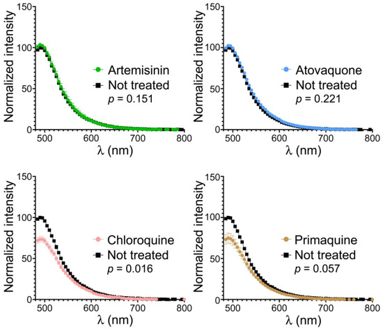 ThT analysis in P. falciparum asexual blood stage cultures of the effect on protein aggregation of four clinically used antimalarial drugs. ThT fluorescence assay of P. falciparum culture extracts normalized to have equal protein content, either non-treated or treated for 4 h with artemisinin, atovaquone, chloroquine, or primaquine at their respective in vitro IC50 (10.8 nM, 1 nM, 7 nM, and 3 µM, respectively, as determined in our experimental setting). The p-values refer to the fluorescence intensity measured at the maximum emission wavelength.
