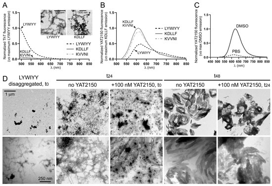 Interaction of YAT2150 with aggregative peptides. (A–C) Relative fluorescence emission intensity of solutions of non-disaggregated KDLLF, KVVNI, and LYWIYY peptides treated with YAT2150 and ThT. Peptides (12.5 µM each) were incubated in the presence of (A) 25 µM ThT or (B) 10 µM YAT2150 before proceeding to measuring fluorescence emission. The insets in panel (A) show representative TEM images of the aggregates formed by LYWIYY and KDLLF. (C) Fluorescence emission spectra of peptide-free 10 µM YAT2150 solutions in PBS (dashed line) and DMSO (solid line). (D) Transmission electron microscopy analysis of the effect of 100 nM YAT2150 on the aggregation of LYWIYY at 24 h and 48 h after undergoing a disaggregation process. Size bars: 1 µm (upper panels, 30,000×), 250 nm (lower panels, 120,000×).