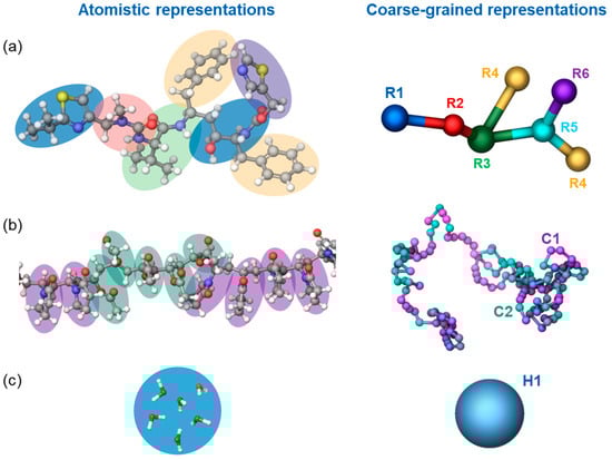 The reference AA MD system contained an 80:20 wt% ratio of water and solute. Additionally, the solute proportion consisted of 12:88 wt% ritonavir in PVPVA64. To prepare this simulation system, molecules were initially placed into an expanded simulation cell with an initial density of 0.5 g/cm3. As part of this process, non-solvent molecules were constructed using a random walk scheme (tangled chain) as implemented in the disordered system builder panel of the Maestro Materials suite. Non-bonded interactions were modeled by a sum of Coulombic and 6–12 Lennard-Jones (LJ) potentials (the latter represents a sum combination of excluded volume and dispersion interactions). These potentials, as well as valence interaction terms, were parameterized according to the OPLS4 forcefield [50]. Dispersive interactions were limited to a maximum interatomic distance of 9 Å with a long-range correction term for interactions beyond that distance, while electrostatic interactions were calculated using the U-series treatment [51]. The equilibration and following production simulations were carried out in the isothermal-isobaric (constant number of particles, pressure, and temperature—NPT) ensemble at 310 K and 1 bar for 100 ns using the Nose-Hoover chain thermostat [52] and the Martyna-Tobias-Klein barostat [53], with respective relaxation constants of 1 and 2 ps and a timestep of 2 fs for most interactions except for the long-range electrostatic interactions for which the time step was 6 fs.