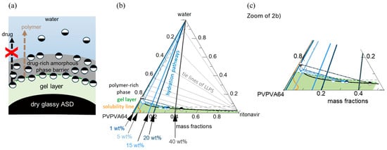 A previous thermodynamic modeling approach was utilized to predict the interfacial behavior between PVPVA64-based ASDs and water [24]. It considers various interconnected processes, such as water ingression, LLPS, and crystallization, which collectively determine the interfacial behavior between the ASD and water and, subsequently, the dissolution performance of the formulation [24]. During dissolution, successive layers with increasing water concentration from the core to the surface of the ASD are formed as water ingresses the formulation. These layers, schematically depicted in Figure 2a, are mainly a water-free core layer (dry glassy core), a hydrated but glassy layer (gel layer) below the “escape glass transition (eGT)”, and a sufficiently hydrated layer above eGT, which erodes into the bulk aqueous medium as previously described by Dohrn et al. [24]. For a slow crystallizing drug, LLPS can occur within the hydrated layers, leading to the formation of a hydrophobic drug-rich amorphous barrier at the interface. The interplay between the different levels of hydration in the layers and potential phase transformations can be understood by tracing the hydration pathway for a specific drug-loaded ASD (DL-ASD) through a ternary drug/polymer/water phase diagram. The modeled ternary phase diagram for the ritonavir/PVPVA64/water system and the hydration pathways for the investigated ASD DLs are shown in Figure 2b,c.