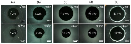 METT images at 37 °C of (a) 1 wt%, (b) 5 wt%, (c) 15 wt%, (d) 20 wt%, and (e) 40 wt% ritonavir-DL ASD discs after 10 and 40 min.
