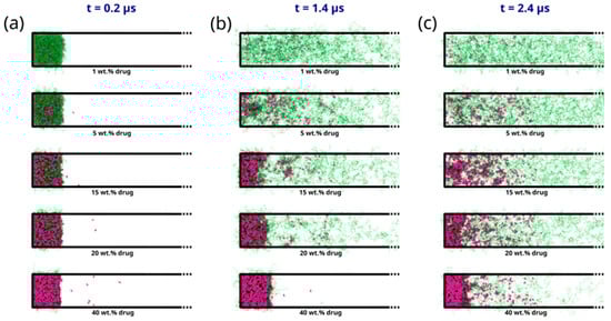 In addition to the dependence of the ASD dissolution behavior on DL, the results in Figure 5 can also be correlated to the different interfacial ASD zones formed during the dissolution process, which has already been discussed in the thermodynamic modeling section. In direct correlation to the scheme shown in Figure 2a, the formation of different zones from the bulk aqueous phase to the dry ASD phase can also be observed from the MD simulations. This is particularly well noticeable in the intermediate DLs (e.g., 15–20 wt%) at 1.4 μs of the simulation (cf. Figure 5b). It is noteworthy that the partial solubilization of the polymer leads to the formation of a phase containing solubilized polymer with drug-rich phase clusters close to the ASD and the aqueous phase. This agrees with the predicted LLPS formed at the ASD/water interface (gel layer), as suggested by Figure 2b. Focusing on the region close to the core ASD, it is also noticeable that the polymer is less solubilized than in the previous zone and that the drug molecules start to form drug-rich clusters before being carried away into the bulk aqueous phase. This also agrees with the suggested ASD/water interface hydration mechanism in Figure 2b. It should, however, be mentioned that although the effect or impact of the glass transition described in the thermodynamic modeling section cannot be captured in the MD simulations, the formation of the drug-rich phase and its consequential impact on the dissolution behavior is in very good alignment with the thermodynamic modeling predictions.