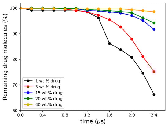 As seen in Figure 5a–c, the early molecular modeling simulation results show a clear dependence on the ASD DL. For 1 wt% DL, a quick disaggregation of the polymeric matrix in the ASD is observed together with the release of isolated drug molecules into the aqueous phase. A thorough polymer disaggregation is still observed at 5 wt%; however, the aggregation of the drug molecules into drug-rich phase clusters released into the aqueous phase can be noted. This observation is akin to LLPS into drug-rich and polymer-rich phases in the gel layer as the ASD is released into the aqueous phase, predicted by the thermodynamic modeling (Figure 2b and Table 6) and also observed in the METT image in Figure 3b. Interestingly, these drug clusters seem to be closely associated with the solvated polymer. These interactions will be analyzed in more detail later. As the DL further increases (15–20 wt%), the size and amount of the drug-rich phase clusters tend to increase, and the polymer matrix no longer fully disaggregates at the end of the 2.4 μs of simulation, indicating the dissolution kinetics of the ASD are slowing down. At this point, the ASD shows a fully solvated polymer phase with increased drug-rich phase clusters, which form the main aggregate. At an even higher DL (40 wt%), interestingly, the drug-rich phase clustering becomes so pronounced that only a smaller percentage of polymer and drug molecules appear to leave the ASD. This agrees very well with the predicted LLPS phase behavior based on the thermodynamic modeling (Table 6), which indicates that the ritonavir-rich phase excessively forms the major phase and is confirmed by the METT image in Figure 3e. The observed trend of decreasing relative drug dissolution with increasing DL is easily summarized by computing the percentage of molecules remaining in the simulation box (cf. Figure 6). In Figure 6, it is evident that the dissolution of the drug molecules slows down with increasing DL of the ASD, and a negligible amount of the drug is dissolved at 40% DL. This dissolution dynamics is highly comparable to the experimental results reported by Krummnow et al. [22] and Indulkar et al. [27]. It also agrees with the thermodynamic modeling results from the previous section, not only in terms of the formation of drug- and polymer-rich phases but also in terms of the DL required to shift the relevance of the drug-rich phase with respect to the dissolution behavior of ritonavir/PVPVA64 ASD.