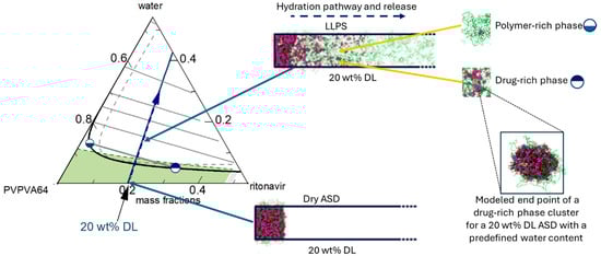 ) phases after LLPS at the interface. A schematic connection between the hydration pathway and the MD dissolution simulation of 20 wt% DL ASD is shown on the right.