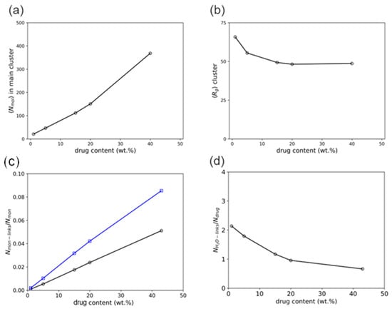 Series of analyses obtained from late-stage molecular simulations as functions of the DL: average number of drug and polymer molecules in the main self-assembled cluster, Nmol (a), average radius of gyration of said cluster, Rg (b), average number of close contacts between drug and polymer monomer particles per monomer, Nmon-links/Nmon (c), and average number of close contacts between drug and water particles per drug molecule, NH2O-links/Ndrug (d).