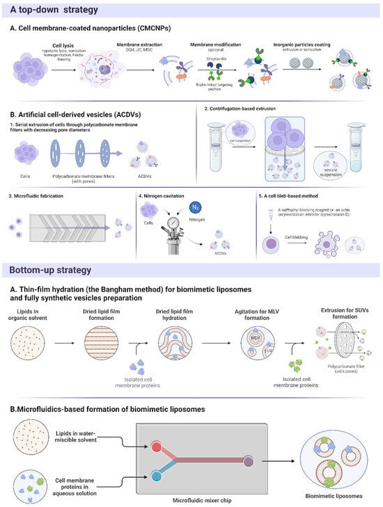 BMNPs can be prepared using top-down or bottom-up strategies (Figure 1). In the top-down approach, bulk materials are broken down into smaller particles that can be subsequently used for drug delivery. The most frequently used top-down strategy employs the coating of NPs with cell membranes. In this approach, cell membranes are isolated and attached to smaller carriers camouflaging their synthetic surface [10]. Another example of a top-down approach is a method in which whole cells are disintegrated and used as precursor material to generate smaller nanovesicles [11] called exosome-mimetic nanovesicles or cell-derived nanovesicles. However, according to the minimal information from studies of extracellular vesicles (MISEV2023), the term artificial cell-derived vesicles (ACDVs) for vesicles generated from extruded cells is recommended [12]. ACDVs can be produced by using virtually any cell type, saving up to 3 days of manufacturing, and providing ~250-fold more product than naturally derived EVs [13,14]. Alternatively, a bottom-up strategy utilizes basic components, such as proteins and lipids, as building blocks to form nano-sized biomimetic carriers. The bottom-up approach allows for the full control of all particle characteristics and provides greater potential for scalability.