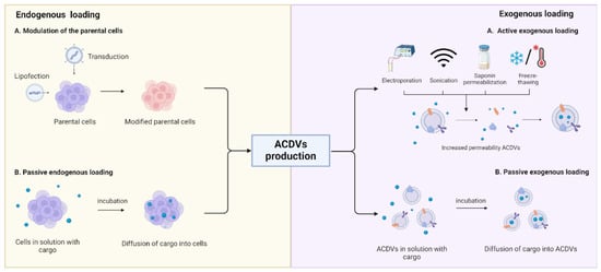 Similarly to EV loading strategies, endogenous or exogenous loading can be used for ACDV cargo packaging. Endogenous loading can be achieved by modulating the parental cells. Producing cells can be transduced to overexpress nucleic acids of interest (Figure 2). Transduction is usually performed on cells that are difficult to transfect, such as primary cells [88]. For instance, shRNA against the c-Myc gene was loaded into ACDVs by culturing embryonic mouse fibroblast cells transduced with lentiviruses encoding shRNA [89]. shRNA was then processed within the cell to create siRNA, which was capable of gene silencing and reduced gene expression by approximately 50%.