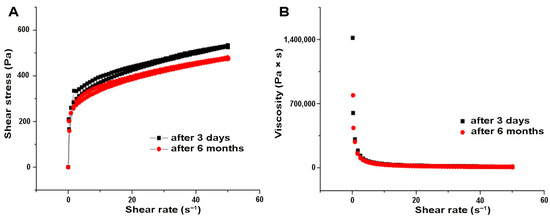 Dependence of (A) shear stress; (B) viscosity versus shear rate at different time points.