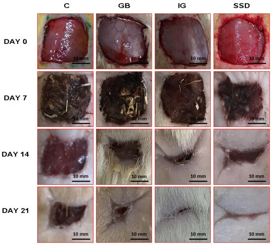 The effect of applied formulations on the healing of wounds caused by the excision method on different days (0, 7, 14, 21). C—control group; SSD—silver sulfadiazine; GB—gel base; IG—immortelle gel.