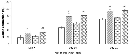 Effects of the applied formulations on wound contraction caused by the excision method. Values are expressed as mean ± standard deviation (n = 8). a Statistically significant difference at the p < 0.05 level compared to the C group; c statistically significant difference at the p < 0.05 level compared to the GB group; C—control group; SSD—silver sulfadiazine; GB—gel base; IG—immortelle gel.