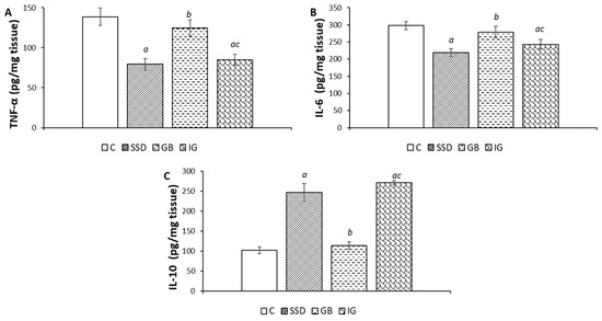 After sacrifice, samples of the wound tissue were taken and stored at −80 °C to estimate the markers of inflammation. A sample of skin tissue (100 mg) was homogenized with 0.5 mL of cell lysis buffer. The obtained homogenates were centrifuged at 5000 rpm for 10 min at a temperature of 4 °C. The obtained supernatants were stored at a temperature of −70 °C. Determination of the concentration of inflammation markers TNF-α, IL-6, and IL-10 in the supernatant obtained from skin tissue was carried out via ELISA kit according to the instructions.