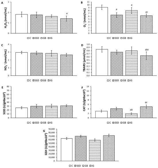 The effects of the applied formulations on pro-oxidative markers in the plasma of animals with a wound caused by the excision method: (A) H2O2; (B) O2−; (C) NO2−; (D) TBARS; (E) SOD; (F) CAT; (G) GSH. Values are expressed as mean ± standard deviation (n = 8). a Statistically significant difference at the p < 0.05 level compared to the C group; b statistically significant difference at the p < 0.05 level compared to the SSD group; c statistically significant difference at the p < 0.05 level compared to the GB group; C—control group; SSD—silver sulfadiazine; GB—gel base; IG—immortelle gel.