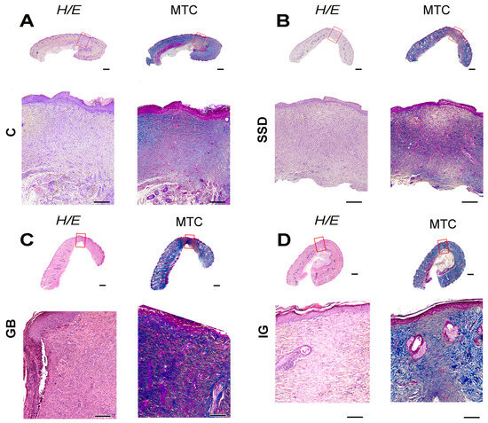 Representative view of wound tissue stained with hematoxylin–eosin (H/E) and Masson trichrome (MTC) technique; scale bar 1 mm. (A) C—control group; (B) SSD—silver sulfadiazine; (C) GB—gel base; (D) IG—immortelle gel.