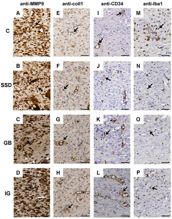 Representative immunohistochemical staining of MMP-9 (fibroblast—black arrow), (A–D), collagen I (fibroblast—black arrow), (E–H), CD34 (blood weasels—black arrow), (I–L), and Iba1 (macrophages—black arrow), (M–P) in the C group, SSD group, GB group, and IG group. Scale bar 50 μm; C—control group; SSD—silver sulfadiazine; GB—gel base; IG—immortelle gel.