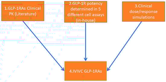 A recent publication presented a thorough evaluation of dose–response relationships [29] for approved antihyperglycemic drugs, utilizing an extensive model-based meta-analysis [30]. At the time of submission, the database encompassed over 300 studies on more than 30 drugs belonging to 6 pharmacological classes. Furthermore, this platform allows for the generation of treatment dose-effect simulations https://www.comparediabetesdrugs.com (accessed on 10 January 2024). However, due to the significant heterogeneity in the structure, protein binding, potency, dosing regimen, and pharmacokinetics of these drugs, the dose–response information cannot be directly utilized for predicting the efficacy of pre-clinical candidates. In this work, we have established the relationship between (1) clinical exposures, (2) in vitro potency generated in well-characterized GLP-1R expressing cell lines [25], and (3) simulated efficacy endpoints (body weight and HbA1c) for clinically approved GLP-1R mono agonists (Figure 1). This facilitates predictions of efficacious concentrations in humans for new drug entities and evaluation of the (4) predictive power of the in vitro assay set-ups.