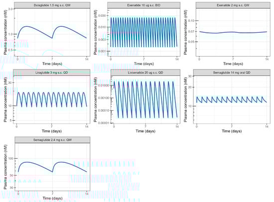 Human pharmacokinetic (PK) data or PK parameters were collected from the literature for the five different GLP-1RAs: liraglutide, semaglutide (oral and subcutaneous), dulaglutide, lixisenatide, and exenatide [BID and QW] (Table S3) [34,35,36,37,38,39]. In cases where random effects models were available, the population PK parameters were used. The compounds exhibited linear PK in the relevant range except for dulaglutide, which had a slight non-linear bioavailability reported [34]. Maximum concentration (Cmax), area under the curve over a dosing interval (AUClast), average concentration (Cavg derived as AUC0-Tau/Tau), and trough concentration (Cmin) were estimated at steady state for different dose levels and are listed in Table S4.