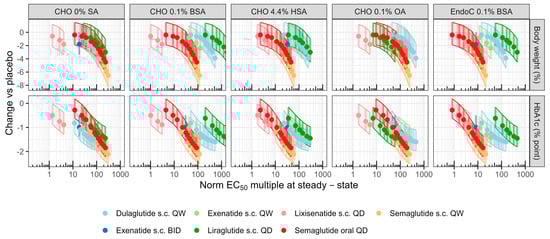 Measurements of plasma protein binding are essential to understand the free drug exposure. Lipidated peptides have variable plasma protein binding characteristics. Non-lipidated GLP-1RAs dulaglutide and exenatide have been shown not to bind to human plasma proteins; therefore, estimating EC50 in vitro at different protein concentrations does not lead to changes in the estimation (Table S1). For semaglutide, liraglutide, and lixisenatide, values from the literature were used [31,32,33]. The values used are shown in Table S2.