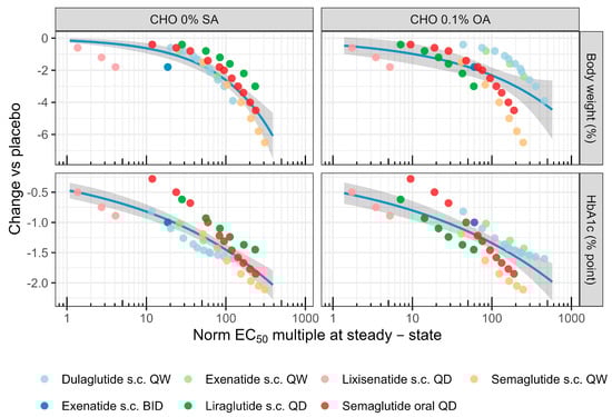 Clinical main endpoints for GLP1-RAs (HbA1C and body weight) at therapeutic dose regimens were estimated for a representative disease population using the Clinical Trial Simulator available at https://www.comparediabetesdrugs.com (accessed on 10 January 2024). Importantly, this advanced analysis tool appropriately adjusts for significant confounding factors such as the duration of treatment, baseline levels, background treatment (drug-naive or metformin), and titration schedules. In short, the change from baseline in HbA1c and body weight were simulated at defined dose regimens for evaluated GLP-1R mono agonists (exenatide BID [Byetta] 20 ug s.c. BID; exenatide QW [Bydureon] 1, 2, 3 mg s.c. QW; dulaglutide 0.25, 0.5, 0.75, 1, 1.25, 1.5, 1.75, 2, 2.5, 3, 4 mg s.c. QW, lixisenatide 10, 20, 30 s.c. QD, liraglutide 0.3, 0.6, 0.9, 1.2, 1.8, 2.5 mg s.c. QD; semaglutide QW [Ozempic] 0.25, 0.5, 0.75, 1, 1.25, 1.5, s.c. QW, semaglutide QD [Wegovy] 1, 2, 3, 5, 7, 8, 10, 12, 14, 17, 20 mg oral QD), against a placebo group for a 50% drug naive population with 50% of subjects on metformin treatment. Baseline values for HbA1c and body weight were set to 8.5% and 100 kg, reflecting the typical trial population characteristics. Median HbA1c and body weight reduction with an associated 90% credible range by week 52 of treatment were calculated for each drug and dose regimen collected from 100 virtual trials using a fixed sample size of 100 subjects (100 × 100 simulated trials).