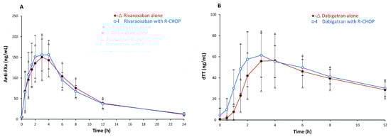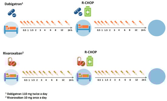 Blood samples were obtained to assess the pharmacodynamics of rivaroxaban and dabigatran on two separate occasions: the first timepoint was the day before starting R-CHOP chemotherapy and the second timepoint following the initiation of R-CHOP chemotherapy. The time interval between the two occasions was 24 h. Blood samples were drawn immediately before the administration of the DOAC and at 0.5, 1, 1.5, 2, 3, 4, 6, 8, 12 and 24 h post-DOAC intake (Figure 1). Plasma anti-Xa activity was measured for participants in the rivaroxaban group and plasma diluted thrombin time (dTT) for participants in the dabigatran group [16,17,18].