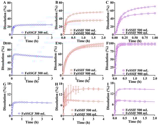 Dissolution profiles of formulations in different dissolution media over time. ((A,D,G) are the dissolution profiles of rivaroxaban, ticagrelor, and PB-201 formulations in 300 mL FaSSGF medium, respectively; (B,E,H) are the dissolution profiles of rivaroxaban, ticagrelor, and PB-201 in 500 and 900 mL FaSSIF medium, respectively; (C,F,I) are the dissolution profiles of rivaroxaban, ticagrelor, and PB-201 in 500 and 900 mL FeSSIF medium, respectively).