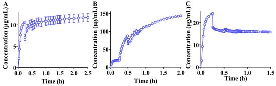Transfer results of formulations from FaSSGF medium to FaSSIF medium. ((A): rivaroxaban formulation; (B): ticagrelor formulation; and (C): PB-201 formulation).
