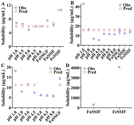 Comparison of predicted and observed solubility of compounds in different media. ((A): rivaroxaban; (B): PB-201; (C,D): ticagrelor).