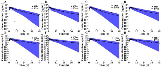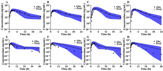 PK data from food effect studies of rivaroxaban in Caucasians [] and the bioequivalence studies in Chinese population [] were sourced from the PubMed database to validate the PBPK model’s capability in capturing absorption characteristics. The simulation results, depicted in Figure 4, demonstrate consistency between predicted and observed PK profiles for both Caucasians (Figure 4A,C) and Chinese populations (Figure 4E,G) in fasted and fed states. The ratios of predicted to observed AUC and Cmax were 1.74 and 1.26, respectively, in the food effect study, and 1.93 and 1.67, respectively, in the bioequivalence study. These results indicate that the rivaroxaban PBPK model can simulate systemic exposure under fed conditions with moderate confidence.