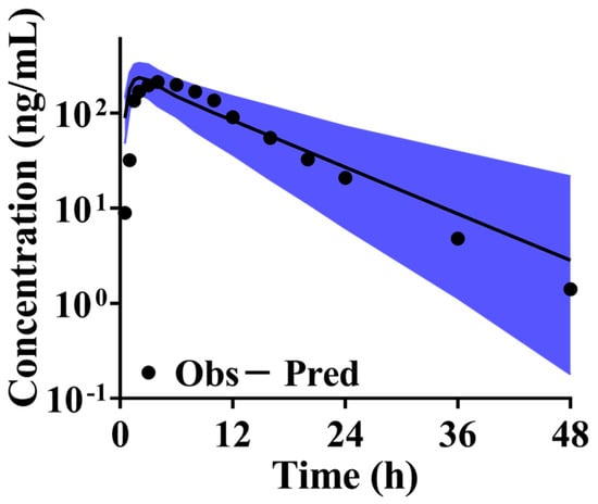 The systemic exposure of PB-201 under fed conditions was estimated, with the ratios of predicted to observed AUC and Cmax being 1.10 and 0.96, respectively. Importantly, the observed C-T points fell within the 90% CI of the predicted profile (Figure 6). Thus, the PB-201 model demonstrates high confidence in capturing the PK characteristics of PB-201 under fed conditions in Caucasians.