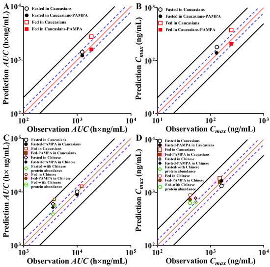 Comparison of PK parameters of rivaroxaban (A,B) and ticagrelor (C,D) before and after model optimization. (Note: Fasted/Fed-PAMPA represents the predicted results of the optimized PBPK model, and other predicted results are obtained before the model optimization; black solid lines: predefined 2-fold boundary; blue dashed lines: predefined 1.25-fold boundary; red solid line: indicates the reference line where predicted values align with observed values).
