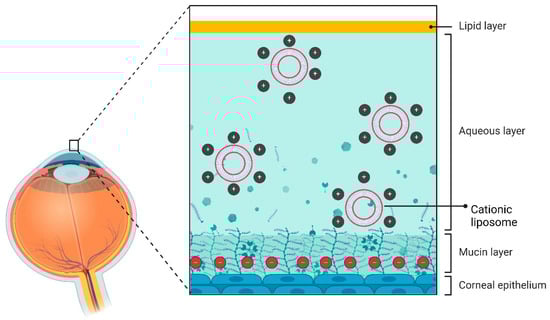 An illustration depicting the interaction of cationic liposomes on the cornea with the negatively charged mucin layer. Created with BioRender.com (accessed on 3 August 2024).