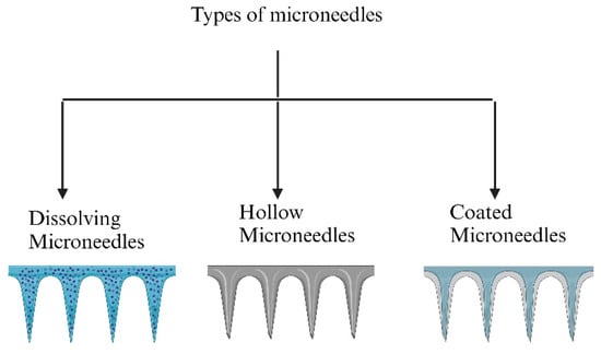 Microneedles (MNs) are a promising, minimally invasive approach that offers the benefits of controlled drug release, convenience of administration, and inexpensive manufacturing [179,180]. For vision-threatening posterior ocular disorders like diabetic retinopathy, age-related macular degeneration, and posterior uveitis, this approach may offer an effective treatment regimen. MNs may lessen the possibility of intravitreal injection-related risks and side effects, including bleeding, cataract development, endophthalmitis, and pseudo-endophthalmitis [181,182]. Additionally, therapeutic agents can be delivered to the retina and choroid using an MN drug delivery system. There are various MNs, including solid, hollow, and dissolved MNs, and polymer-coated polymeric MNs have been investigated and tested [183,184] (Figure 4). Microneedles are designed to pierce only the sclera by hundreds of microns, minimizing injury to deeper ocular tissues. Puncturing the sclera and depositing drug solutions or carrier systems can aid in drug diffusion into deeper ocular tissues, choroid, and neuronal retina [185]. Microneedles filled with drugs greatly improved ocular bioavailability as compared to conventional eye drops [186]. Furthermore, microneedles can target medicine delivery to specific tissues, which might decrease drug wastage. Therefore, as a less intrusive method for administering drugs to the eyes, microneedles are being studied worldwide [187,188].