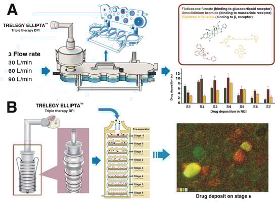 (A) The schematic diagram represents the experimental design for drug deposition from a TRELEGE ELLIPTA™ DPI inhaler (fluticasone furoate, umeclidinium bromide, vilanterol trifenatate) in a Next Generation Impactor (NGI) at different air flow rates. (B) The experimental diagram of drug deposition in an Andersen cascade impactor (ACI) to determine the distribution patterns at each stage using scanning electron microscopy (SEM) and an energy-dispersive X-ray (EDX) analysis system. The drugs are presented by different colors in the bar chart and SEM images. The green color is fluticasone furoate, the red color is umeclidinium bromide, and the yellow/orange color is vilanterol trifenatate.